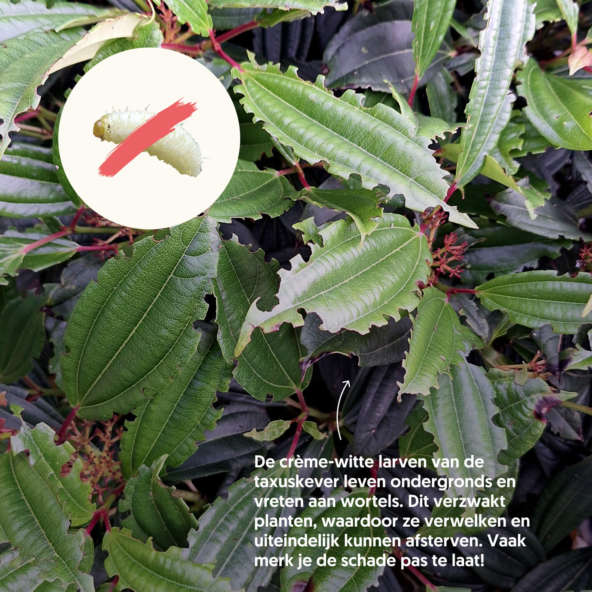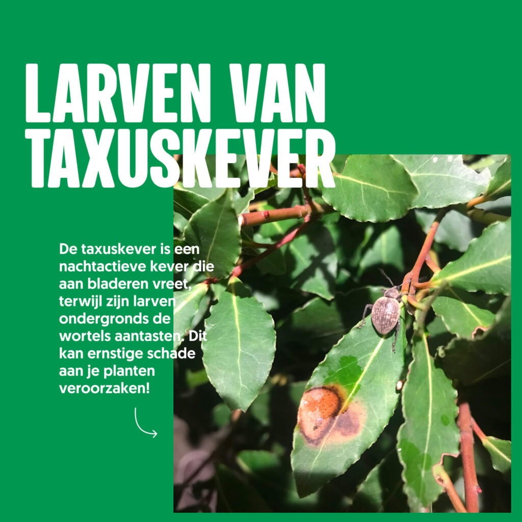 Aaltjes tegen taxuskever, ook bekend als Steinernema kraussei, zijn microscopisch kleine nematoden die natuurlijke vijanden binnendringen via bestaande openingen. Eenmaal binnen scheiden ze bacteriën af die de insecten doden, waarna de aaltjes zich voortplanten in het kadaver en op zoek gaan naar nieuwe vijanden. Dit proces is een natuurlijke en effectieve manier om insectenplagen te bestrijden, zonder het ecosysteem te verstoren.