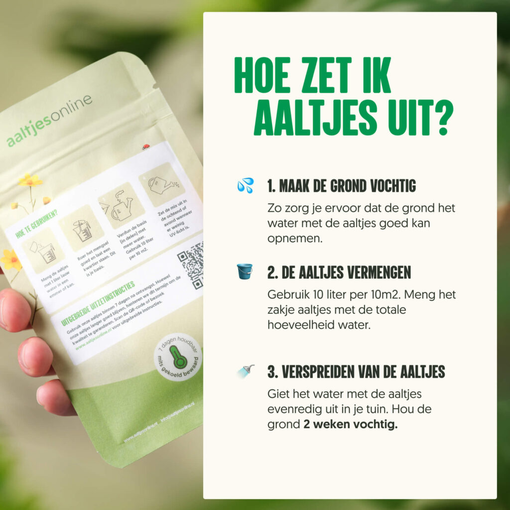 Zet de aaltjes ‘s ochtends of ‘s avonds uit, wanneer er geen zon is. De aaltjes kunnen namelijk slecht tegen UV-licht. Het uitzetten kan gewoon met een gieter. De perfecte omstandigheden zijn vlak voor of vlak na een regenbui. Dit is echter geen voorwaarde voor de werking.