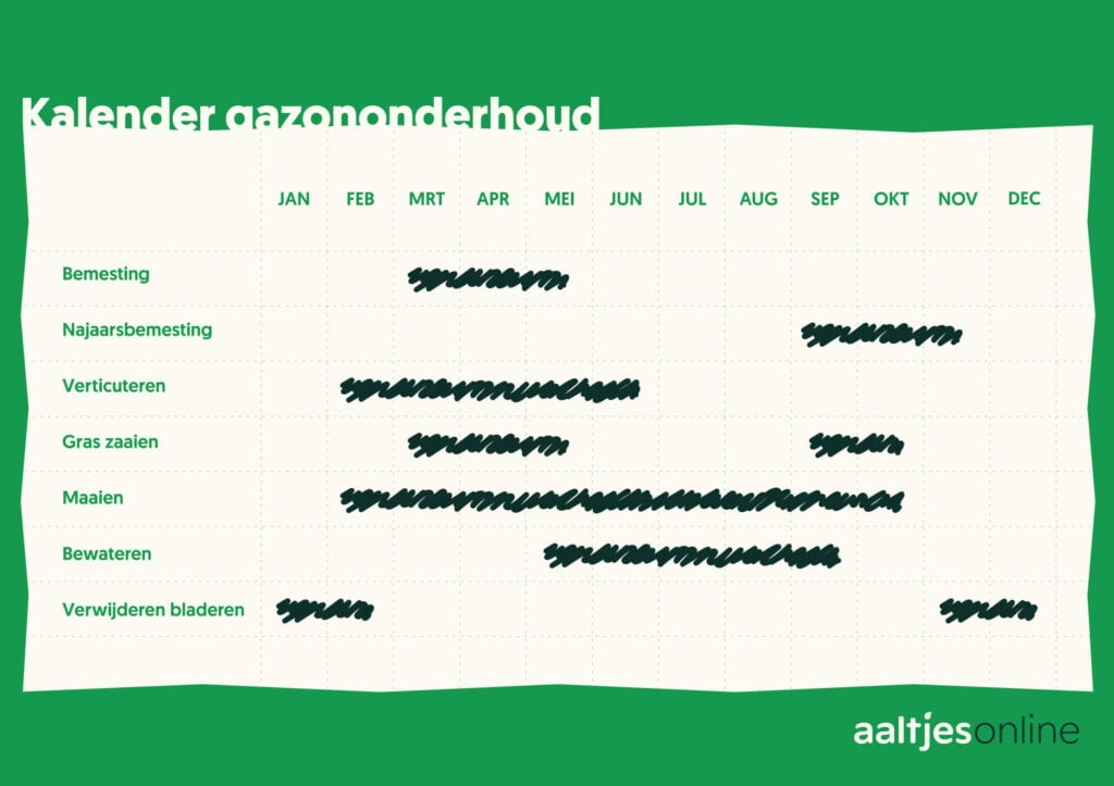 - Bijzaaien van kale plekken: Bijhouden van het gazon en bijzaaien van kale plekken met graszaad.