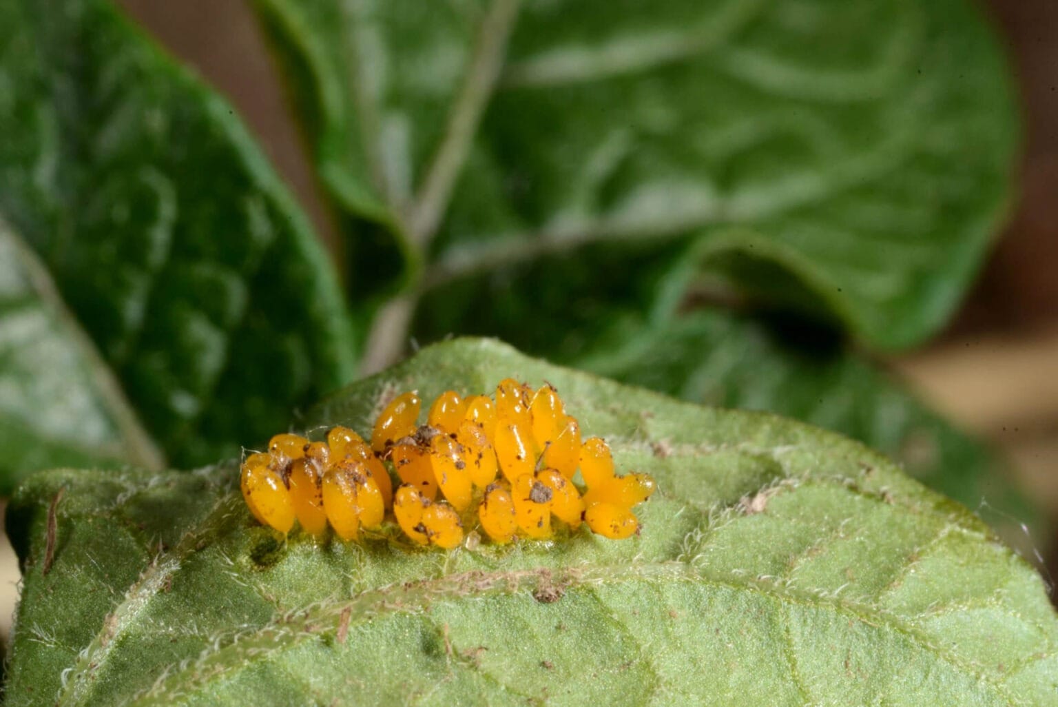 - De eitjes: De volwassen kevers komen in het voorjaar uit hun overwinteringsplaats in de grond tevoorschijn en beginnen met paren. De vrouwtjes leggen eitjes op de onderkant van bladeren van planten. De Coloradokever komt voor op de planten van aardappelen, tomaten en paprika’s. De eieren zijn geel en hebben de vorm van een rugbybal. De eitjes worden aan de onderkant van het blad gekleefd en worden daardoor vaak gemist door het menselijk oog. Eén vrouwtje legt tussen de 300 en 700 eitjes af.