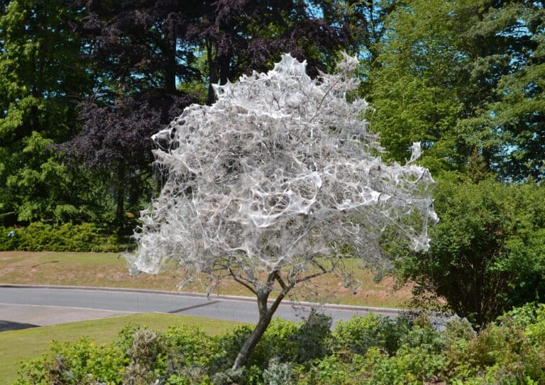 Spinselmotten kunnen binnen enkele weken een boom volledig bedekken, vooral als de populatie rupsen groot is.